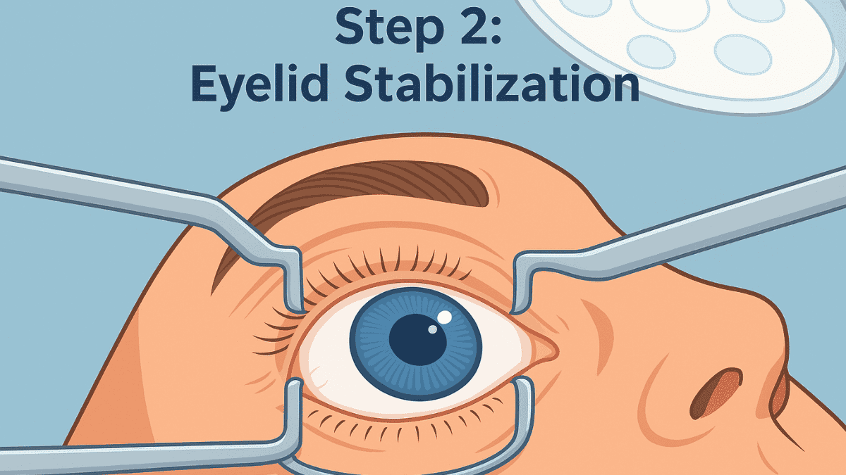A speculum is gently used to hold the eyelids open and prevent blinking.