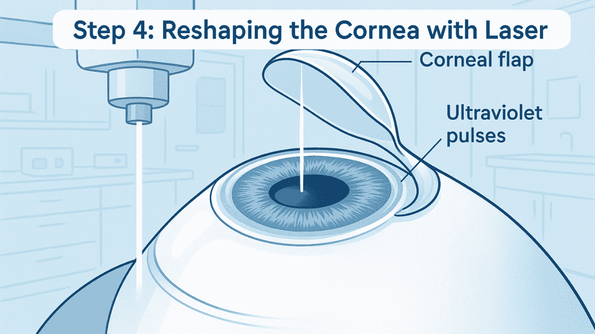 Here’s a more detailed breakdown of what happens during the laser eye surgery: