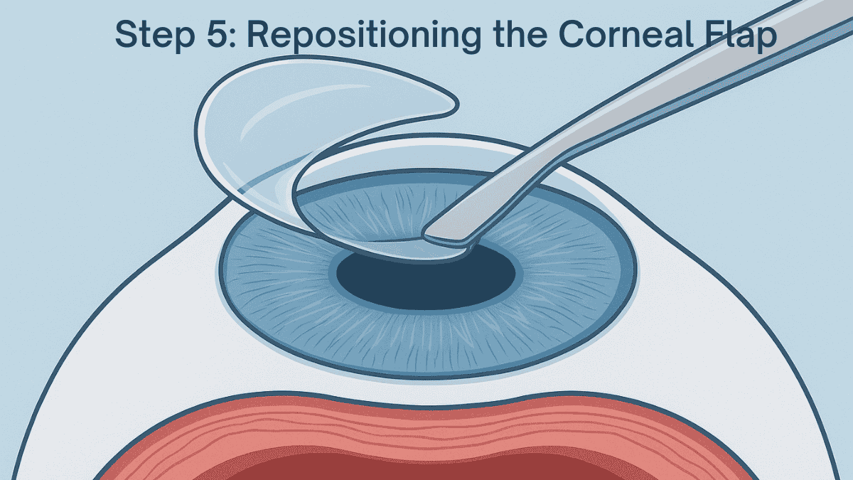 - Once the reshaping is complete, the corneal flap is carefully repositioned back into its original place. It adheres naturally to the underlying stroma without the need for stitches, acting like a natural bandage.